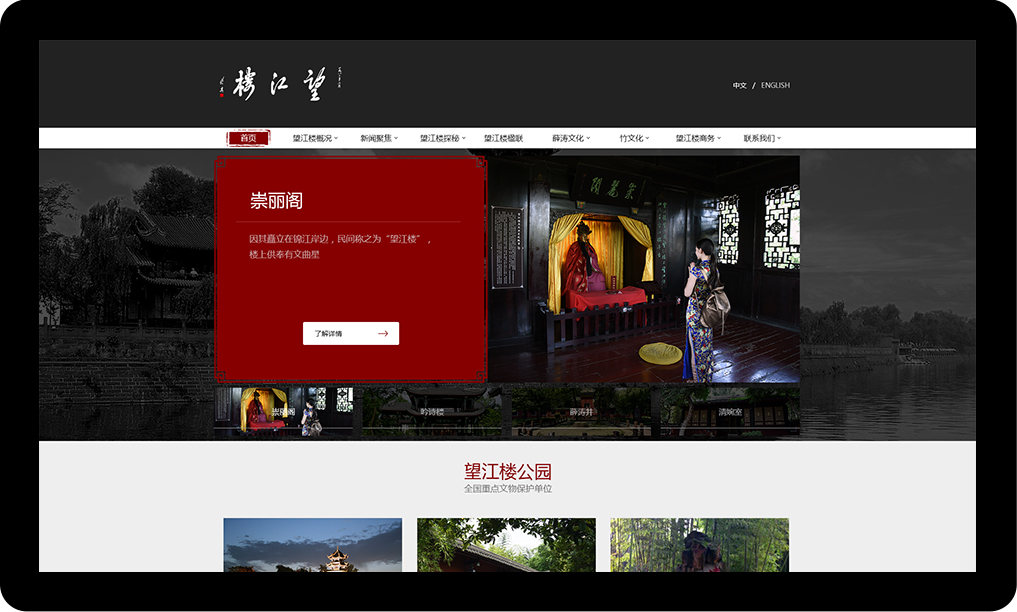 望江樓公園座落在成都東門錦江南岸,以擁有望江樓古建筑群、唐代著名女詩(shī)人薛濤紀(jì)念館等文物遺跡及各類珍奇異竹而聞名中外。全園面積188畝,分為文物保護(hù)區(qū)(39畝)和園林開放區(qū)(149畝),是紀(jì)念唐代女詩(shī)人薛濤的古跡和游覽勝地,現(xiàn)為全國(guó)重點(diǎn)文物保護(hù)單位。