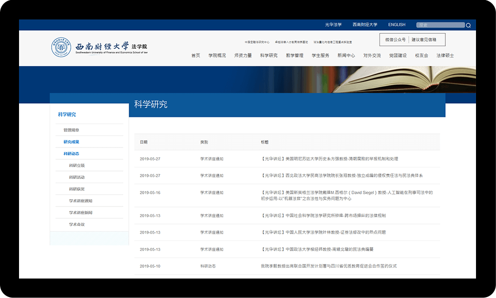 學院積極推進“以科研促教學”、“研學合一”、“理論與實踐并重”的發(fā)展思路。通過實施科研精品工程,強化科研激勵機制,不斷提高學院教師科研水平和科研成果質(zhì)量。截止目前,學院教師主持國家社科基金重大招標項目、中宣部“馬工程”重大項目、國家社科基金項目及省部級以上科研課題200余項。在《中國社會科學》、《法學研究》、《中國法學》、《經(jīng)濟研究》、《管理世界》、《The China Quarterly》、《Economic Inquiry》、《Law & Society Review》等中外期刊上發(fā)表論文千余篇,并在中國、德國、日本等中外知名出版社出版著作130余部。近年來學院100余項成果分別獲得教育部、司法部、四川省人民政府等省部級以上獎勵。